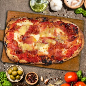 Salsa di pomodoro, mozzarella, prosciutto crudo, stracciatella