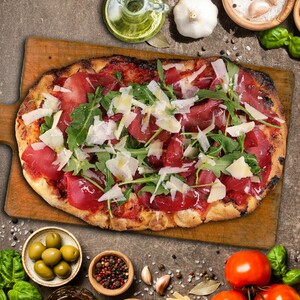 Salsa di pomodoro, mozzarella, bresaola, rucola, scaglie di grana