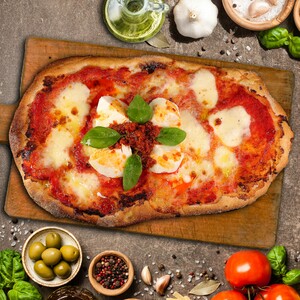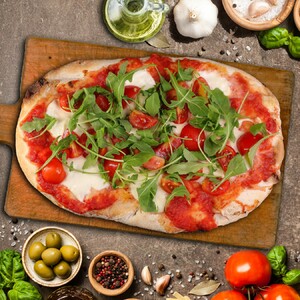 Salsa di pomodoro, mozzarella di bufala, pomodorini, rucola | monoporzione, lunghezza 26 cm circa