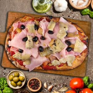 Salsa di pomodoro, mozzarella, prosciutto cotto, funghi porcini, olive nere, carciofi grigliati