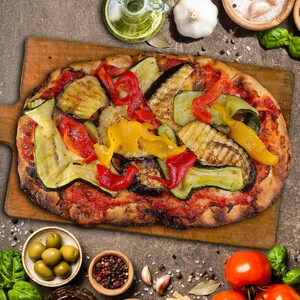 Salsa di pomodoro, mozzarella, melanzane grigliate, zucchine