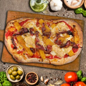 Salsa di pomodoro, mozzarella, cotoletta, emmenthal, bacon